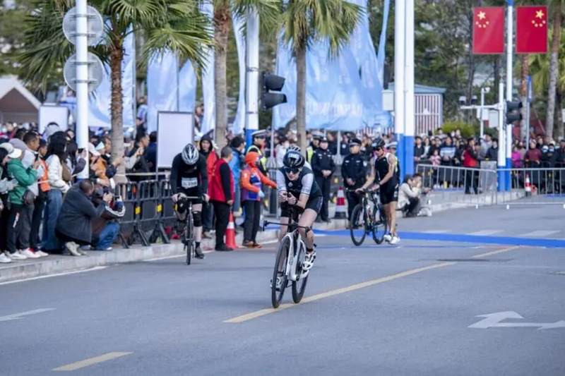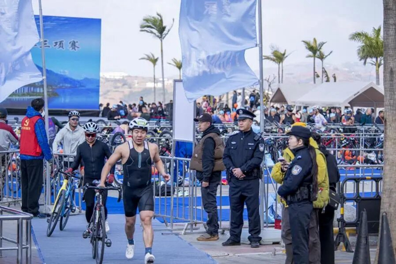 赛场之内,运动员们穿梭于山水画卷之间,在游泳赛段劈波斩浪,在自行车项目中御风而行,在长跑阶段奋力冲刺,不断挑战体能极限,生动诠释了“铁人精神”的坚韧与执着。赛场之外,另一群“铁人”用行动护航赛事平安。