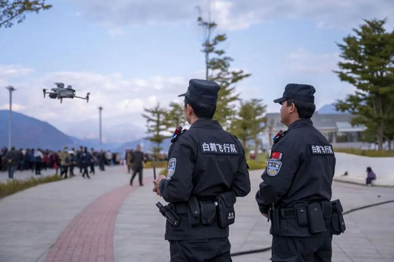 “请围观群众文明观赛,不要横穿赛道。”白鹤飞行队升空巡航,实时观测现场情况,使用警用无人机喇叭对场地周边群众进行安全提示,与地面执勤警力构建起“空地一体、动静结合”的立体防控体系。