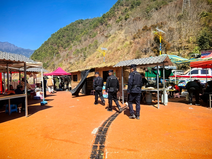 斗龙观景台商家云集、游人往来频繁,是展示贡山形象、守护群众安全的重要窗口。执勤民警辅警定点值守,穿梭在商户与游客之间,细致排查安全隐患,维护现场秩序,耐心回应群众咨询。警灯与风景相映,守护与温暖同行,民警用细致贴心的服务,让每一位驻足观景的群众都能感受到安心与踏实。