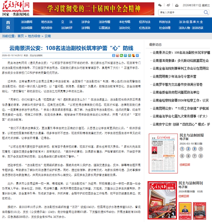 “以前孩子不听话,我们做家长的也不知道该怎么引导。现在有了‘法治副校长’,不光教孩子学法用法,也帮我们掌握了科学的教育方法,真是帮了大忙。”3月7日,在西双版纳州景洪市第一中学“护学岗”现场,学生家长杨女士向前来走访的民警表达了感激之情。