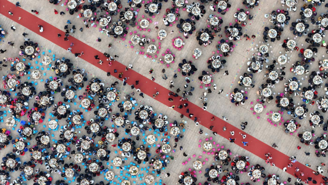这场备受瞩目的“千桌万人磨盘宴”在新平县城民族广场盛大举行。这场宴席曾因1000桌10000人共同用餐获得过吉尼斯世界纪录认证,本次活动更以1600桌16000人共餐的超大规模,再次刷新吉尼斯世界纪录。
