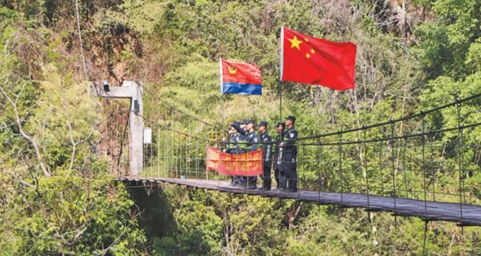 穿越南腊河上的吊桥,再绕过一个山坡,中老缅1号界碑到了。陈力屏住呼吸,稳稳提起笔刷,轻蘸朱红,俯身一笔一画将“中国”二字细细描新。描红完毕,民警们集体面向界碑,庄严敬礼。