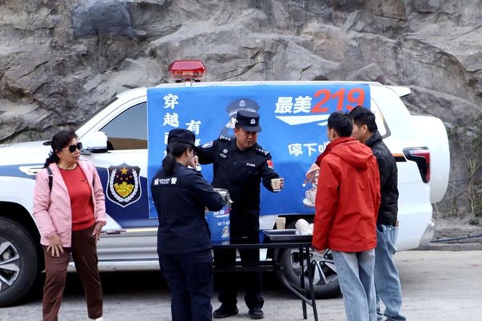 同时,马德飞还为游客发放定制的法律宣传钥匙扣,在送上温暖祝福的同时,普及边境管理、交通安全、反诈防范等知识,让法治宣传融入旅途点滴。他还同步提供路线指引、高原安全提醒、应急药品补给等便民服务,把警“茶”车打造成过往旅客心中最安心、最温暖的旅途港湾。