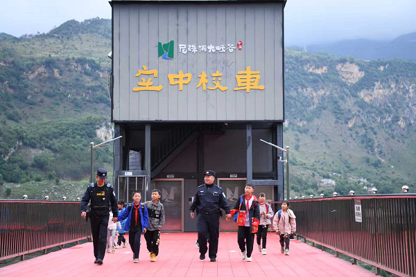每天清晨,民警在站台检查设备、疏导秩序;傍晚放学,准时等候护送学生返程。节假日客流集中时,专门开通学生“绿色通道”,保障求学路顺畅安全。“六一”期间,民警带着礼物走进山区学校,把安全知识和关怀送到孩子身边。这段跨越峡谷的守护,成为当地护校安园的生动实践。