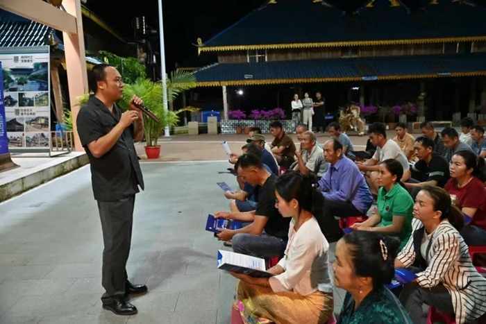 坐落于中老边境的傣族村寨尚冈村拥有200多年历史。夜幕下,易君宇和当地群众围坐在尚冈村铸牢中华民族共同体意识广场,一场别开生面的“乡村夜话”正如火如荼地进行着。这既是“唠家常”、聊聊婚姻家庭事、借款纠纷等群众身边的“烦心事”,更是一场生动的“双语”普法课。