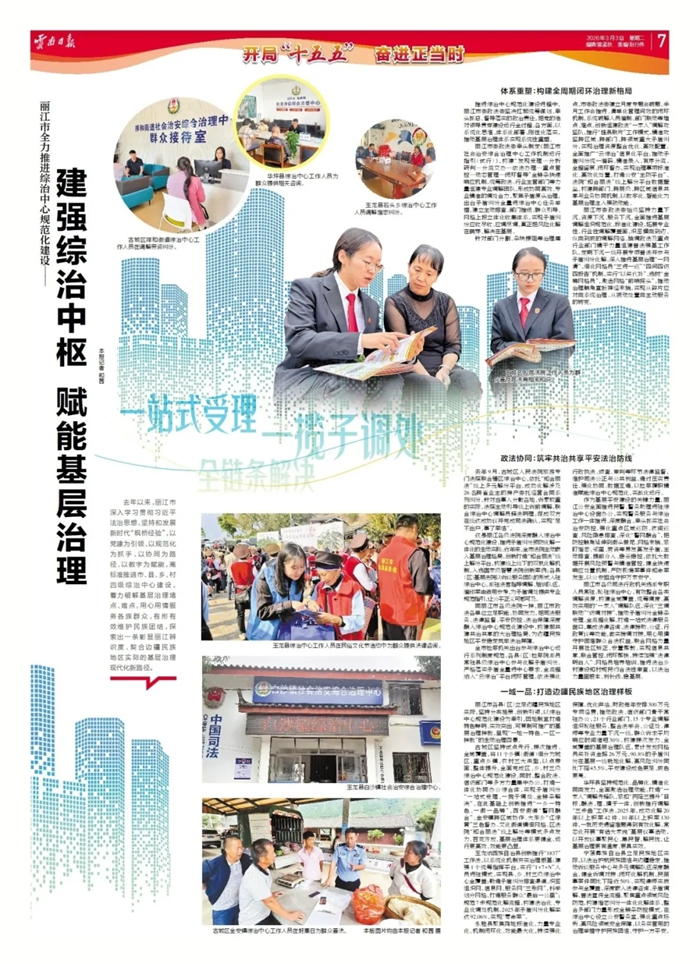 去年以来,丽江市深入学习贯彻习近平法治思想,坚持和发展新时代“枫桥经验”,以党建为引领、以规范化为抓手、以协同为路径、以数字为赋能,高标准推进市、县、乡、村四级综治中心建设,着力破解基层治理堵点、难点,用心用情服务各族群众,有形有效维护民族团结,探索出一条彰显丽江辨识度、契合边疆民族地区实际的基层治理现代化新路径。