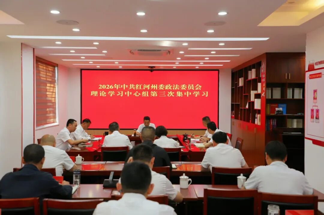 4月9日,红河州委政法委举行2026年理论学习中心组第三次集中学习,深入学习领会习近平法治思想和总体国家安全观,认真贯彻落实中央全面依法治国工作会议和二十届中央纪委五次全会、省纪委十一届六次全会、州纪委九届六次全会及全国、全省、全州两会精神。